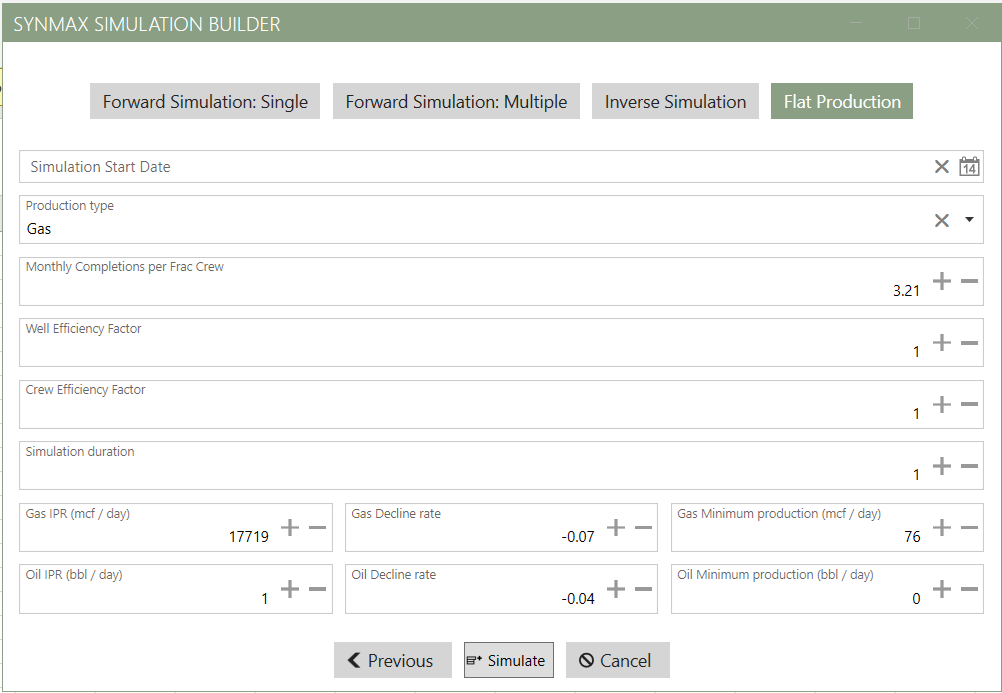 The Flat Production determines the necessary inputs (e.g., number of wells of frac crews) to achieve future production equal to recent production level.