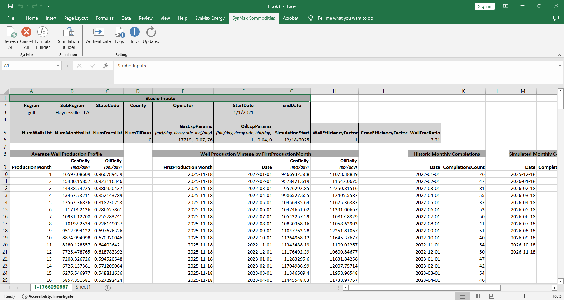 Average Well Production Profile, Well Production Vintage by FirstProductionMonth, Historic Monthly Completions, Simulated Monthly Completions, Historic Average Daily Frac Crews, Simulated Average Daily Frac Crews#